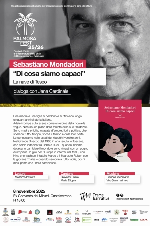 Sarà lo scrittore Sebastiano Mondadori ad aprire, sabato 8 novembre, alle 18, la quarta edizione del «PalmosaFest», la rassegna di arte e letteratura di cui è direttore artistico Bia Cusumano e la cui direzione culturale è affidata alla giornalista Jana Cardinale.