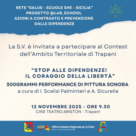 Mercoledì 12 novembre 2025, alle ore 9.30 al Cine Teatro Ariston di Trapani, si terrà la manifestazione provinciale del progetto @Lab_School – Azioni di contrasto e prevenzione delle dipendenze, promossa dalla Rete “Salus – Scuole SHE Sicilia” e finanziata dall’Assessorato regionale all’Istruzione tramite l’USR Sicilia.