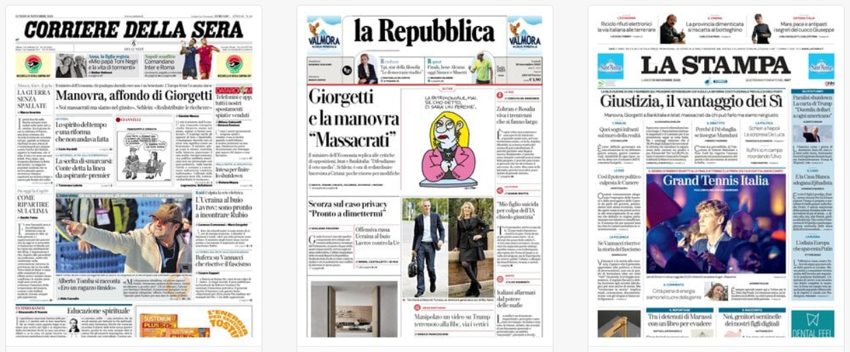 Titoli Corriere della Sera: Manovra, affondo Giorgetti la Repubblica: Giorgetti / e la manovra / «Massacrati» La Stampa: Giustizia, il vantaggio dei Sì Il Sole 24 Ore: Bonus mamme, corsa per 870mila Il Messaggero: Sanità, arrivano le assunzioni Il Giornale: Così la sinistra aiutava i “ricchi” Leggo: Scontro aperto sulla manovra Qn: Manovra, Giorgetti fa muro / «Aiutiamo il ceto medio» Il Fatto: «Nordio era contro le carriere / divise: ha tradito la sua storia» Libero: Chi paga veramente le tasse La Verità: Clandestini fuori controllo Il Mattino: Questi fantasmi il Quotidiano del Sud: Ordinaria emergenza Domani: Manovra, vietato criticare la destra / Giorgetti attacca Bankitalia e Istat