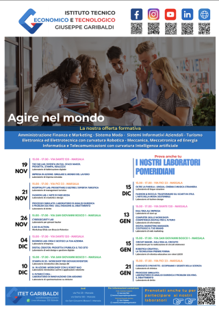 L’ITET “G. Garibaldi” di Marsala rinnova il suo impegno verso le nuove generazioni con un’iniziativa rivolta agli studenti delle scuole secondarie di primo grado: i “Orienta Labs”, laboratori didattici e di orientamento pensati per accompagnare i ragazzi — e le loro famiglie — in una scelta consapevole del percorso di studi superiore. Un orientamento attivo e concreto