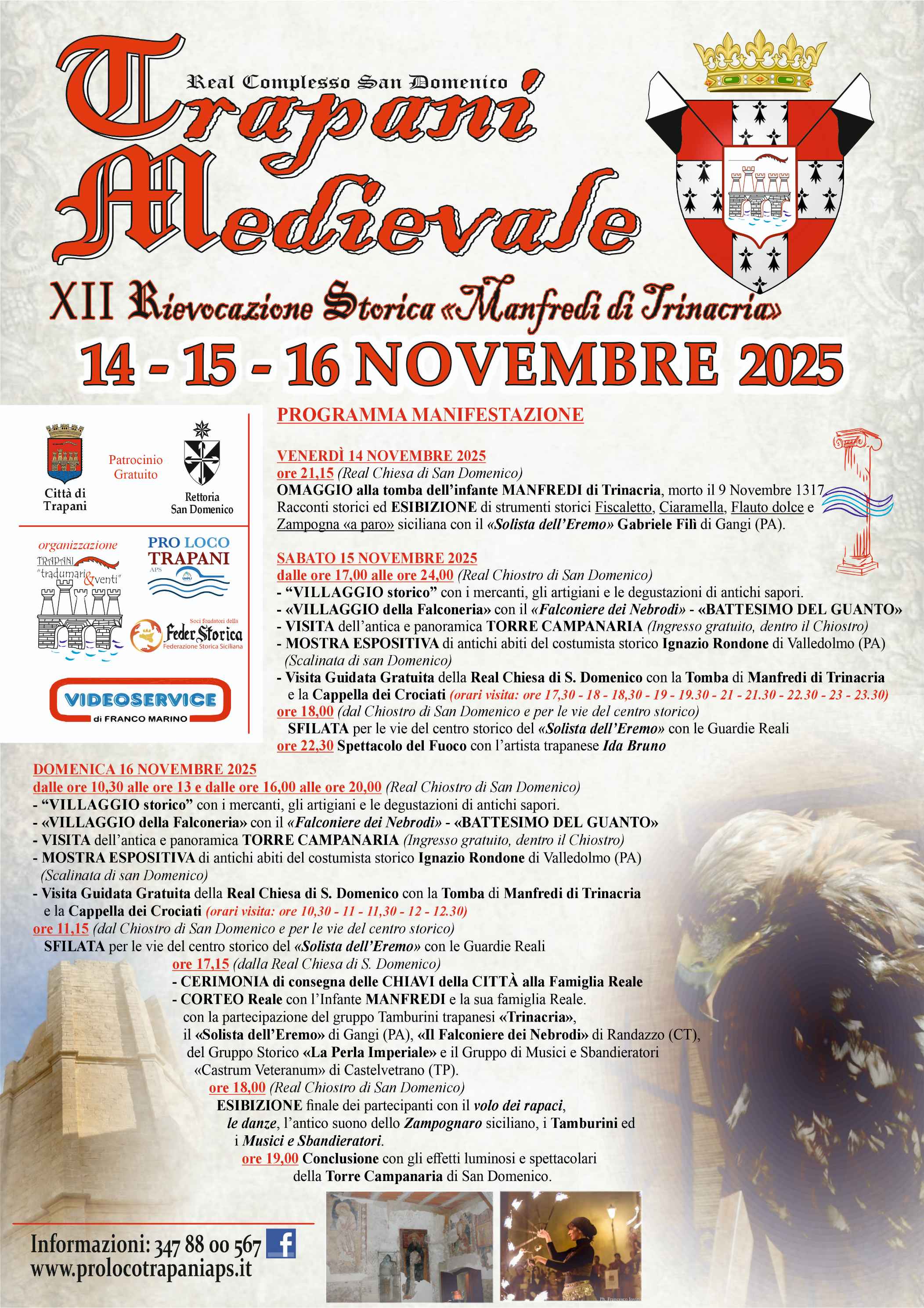 La manifestazione si aprirà venerdì 14 novembre alle 21.14 nella Chiesa di San Domenico. La serata inaugurale prevede un omaggio a Manfredi e un concerto di antichi strumenti siciliani accompagnato da racconti storici dedicati agli Aragonesi e all’antica Trapani. Sabato 15 novembre, alle 22.30, nel Chiostro è previsto lo spettacolo del fuoco curato da Ida Bruni, che ogni anno richiama un pubblico numeroso per la sua forza evocativa e l’intensità scenica. Domenica 16 novembre, alle 17, partirà dalla Chiesa di San Domenico il Corteo Regale: figuranti in abiti d’epoca attraverseranno il complesso monumentale fino al Chiostro, dove si terranno le esibizioni finali. La rievocazione si chiuderà con l’illuminazione della Torre Campanaria, trasformata per l’occasione in un suggestivo scenario medievale.