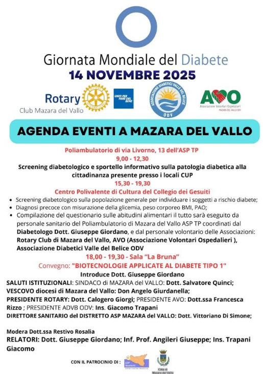 In occasione della Giornata Mondiale del Diabete del 14 novembre, il Comune di Mazara del Vallo promuove una serie di iniziative dedicate alla prevenzione e alla sensibilizzazione sulla patologia.
