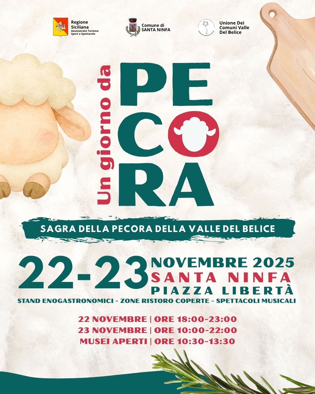 Questo e tant’altro si potranno degustare nel week-end del 22 e 23 novembre a Santa Ninfa (Trapani) in occasione di “Un giorno da pecora”, l’iniziativa promossa dal Comune e giunta quest’anno alla undicesima edizione. Come già lo scorso anno la festa si svolgerà in due giorni: si inizia nel pomeriggio di sabato (ore 18) con l’inaugurazione degli stands in piazza Libertà e in via G. Garibaldi per poi continuare nella giornata di domenica con le degustazioni che si svolgeranno di mattina e pomeriggio (ore 10-22).