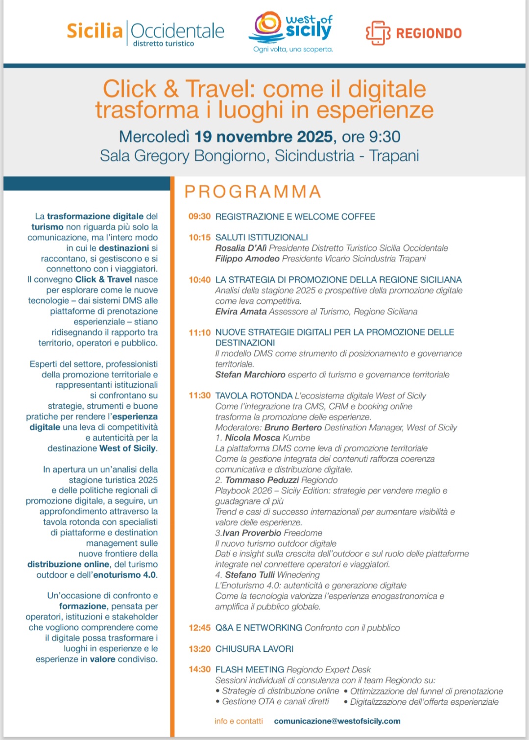 All’incontro parteciperà l’assessore regionale al Turismo Elvira Amata, che presenterà le nuove strategie digitali della Regione Siciliana. L’apertura dei lavori è affidata alla presidente del Distretto, Rosalia D’Alì, e al presidente vicario di Sicindustria, Filippo Amodeo.