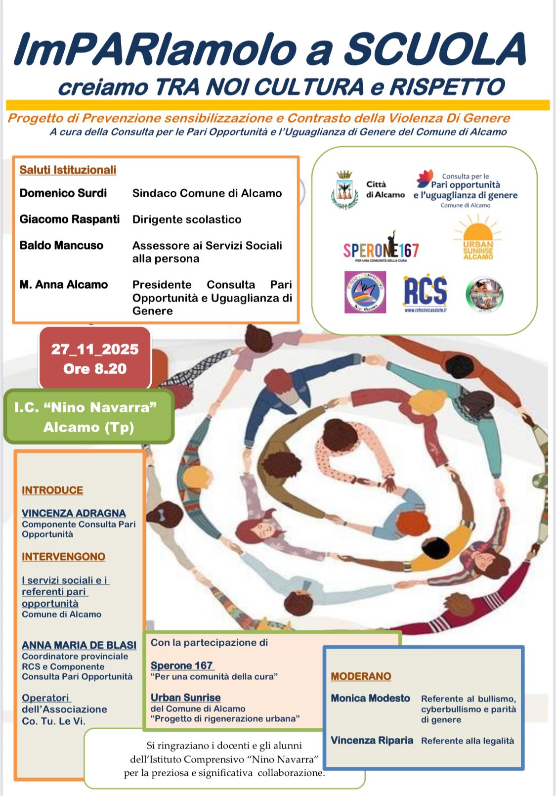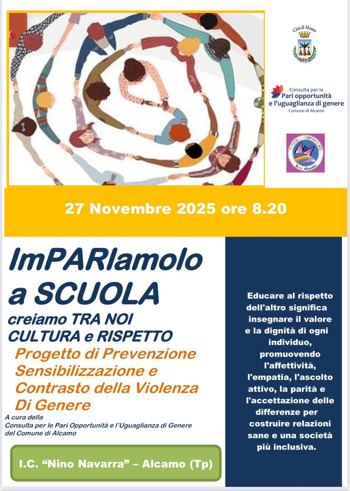Mentre il 27 novembre, a partire dalle ore 8.20, presso l’IC Navarra ci sarà l’evento di prevenzione, sensibilizzazione e contrasto alla violenza di genere dal titolo “Impariamolo a scuola” - creiamo tra noi cultura e rispetto. Infine, sabato 6 dicembre, a Castellammare del Golfo ci sarà l’evento MEDICINA DI GENERE "Il Valore dell'Umanizzazione tra la Cura e lo Stato dell'Arte nella prossimità tra sfide e le prospettive di Genere". Dichiara la Presidente della Consulta Pari Opportunità e Uguaglianza di Genere del comune di Alcamo, Anna Alcamo “anche quest’anno Facciamo Rete con le Commissioni Pari Opportunità dei comuni di Castellammare del Golfo, Erice, Marsala, Trapani, Salemi, Buseto Palizzolo, Campobello di Mazara, Menfi, San Vito Lo Capo, Mazara del Vallo, Ragusa, Valderice e Capaci con cui stiamo lavorando al progetto che porta lo stesso nome “Facciamo Rete. Ogni 25 novembre - continua la Presidente - rinnoviamo il nostro impegno nel ricordare le troppe donne che hanno subito violenza; la violenza di genere non è solo un fatto privato o isolato: è una ferita collettiva che attraversa la nostra società e che chiede risposte concrete, culturali e civiche.Fare rete significa unire le forze, le esperienze e le sensibilità dei nostri Comuni per promuovere una cultura del rispetto e della parità, affinché nessuna donna si senta sola e senza voce. L’obiettivo è trasformare la consapevolezza in azione, la solidarietà in presenza, e le parole in impegni quotidiani. Solo attraverso l’educazione, l’ascolto e la collaborazione possiamo contribuire a cambiare una realtà che ancora oggi segna troppe vite. Il mio auspicio – conclude Anna Alcamo - è che questa rete continui a crescere, diventando un esempio concreto di come le istituzioni, insieme ai cittadini, possano farsi portavoce di una nuova cultura dei diritti, dell’uguaglianza e della dignità umana”.