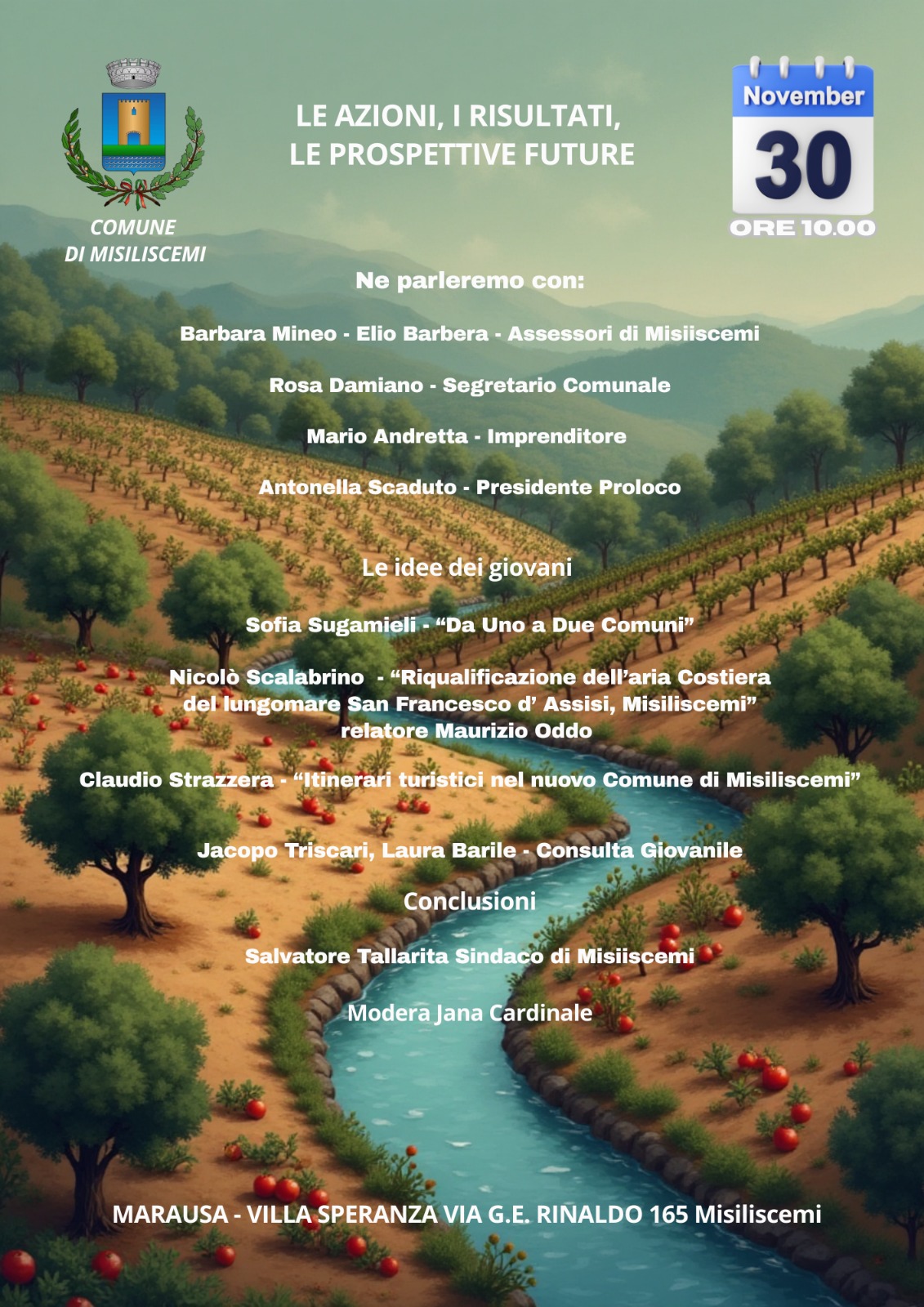 Il primo cittadino parla di un metodo – ascolto, partecipazione, confronto e responsabilità – e invita cittadini, associazioni e professionisti a partecipare: «Tre anni fa abbiamo avviato un percorso impegnativo per dare a Misiliscemi un’identità amministrativa e culturale forte. Oggi possiamo raccontare quanto è stato fatto e ciò che stiamo costruendo per il futuro».