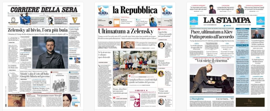 Titoli Corriere della Sera: Zelensky al bivio, l’ora più buia la Repubblica: Ultimatum a Zelensky La Stampa: Pace, ultimatum a Kiev / Putin pronto all’accordo Il Sole 24 Ore: Moody’s rialza il rating dell’Italia Avvenire: Kiev al bivio finale Il Messaggero: L’Italia promossa da Moody’s Il Giornale: Zelensky, l’ora più buia Qn: Ultimatum di Trump a Kiev / «O la pace o niente armi» Il Fatto: Kiev parla con Trump / La Ue straparla da sola Libero: La stretta anti-maranza La Verità: Fico, ormeggio superscontato / per la barca (non dichiarata) Il Mattino: Ciriello e Fico, ultimi appelli il Quotidiano del Sud: Ucraina e Ue, l’ora più buia il manifesto: Non si può rifiutare Domani: Zelensky nella morsa Trump-Putin / «La scelta è tra la dignità e gli Usa»