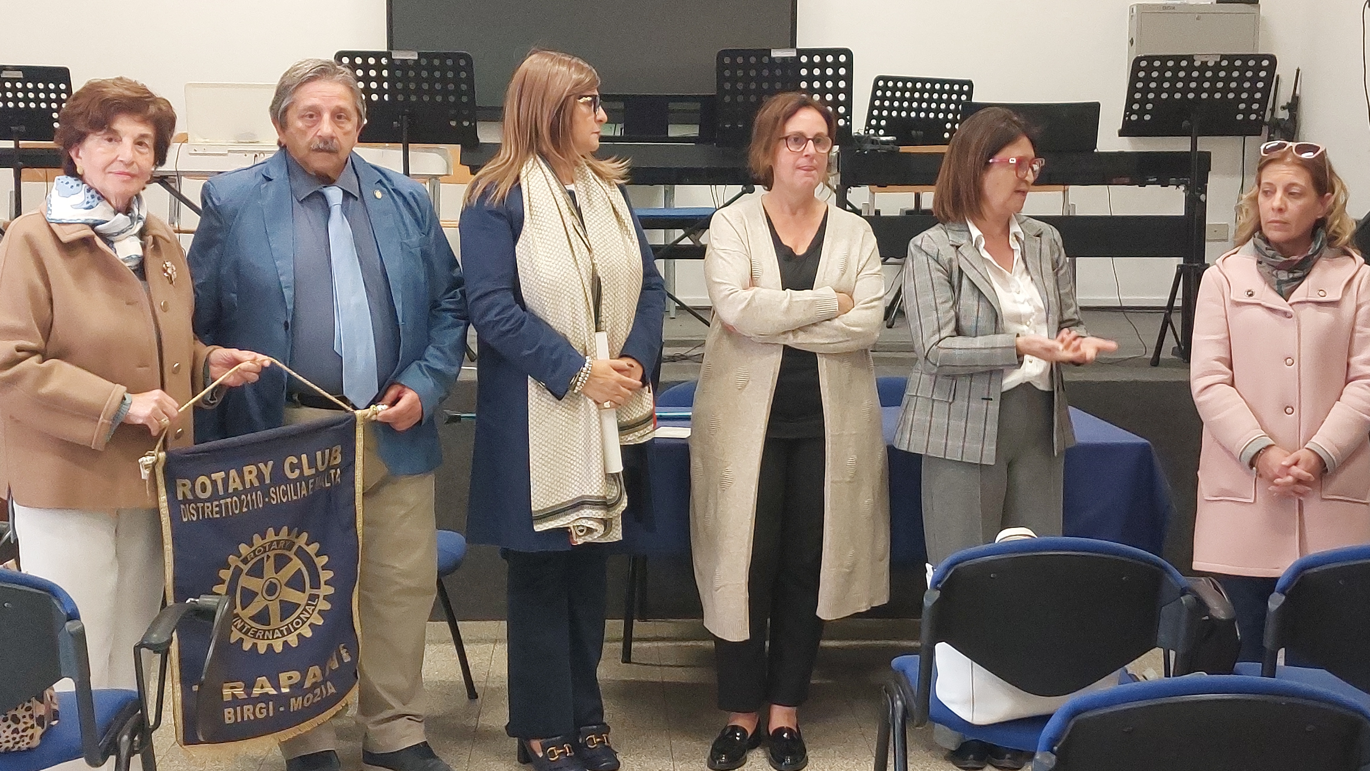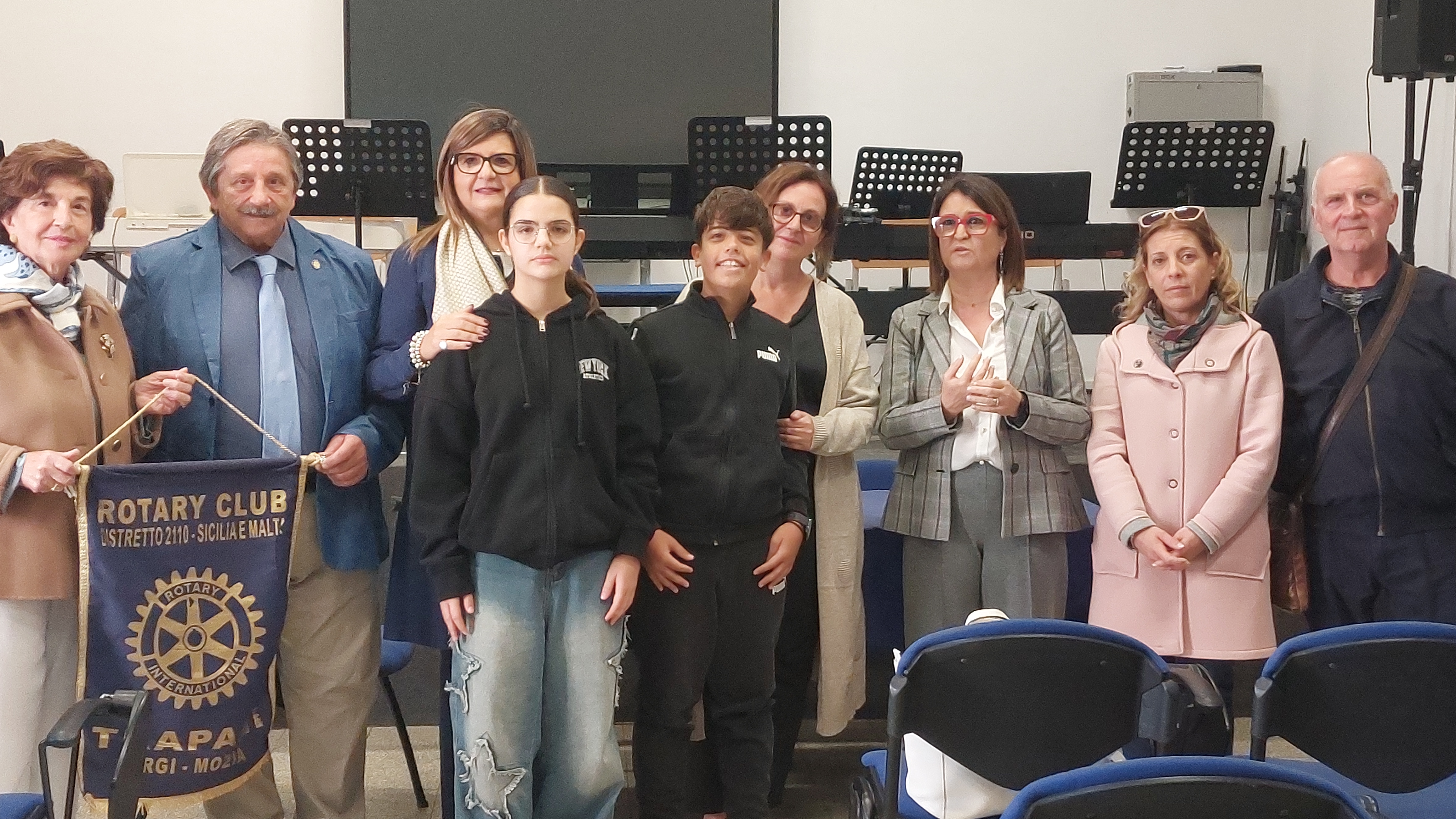 Alla cerimonia hanno partecipato la presidente del Rotary, Mariella De Luca, la dirigente scolastica Barbara Mineo, la famiglia Manuguerra, la psicologa della scuola Dott.ssa Maltese, e le docenti Rindinella, Di Giorgi, Muro, Carollo e Rigirello.