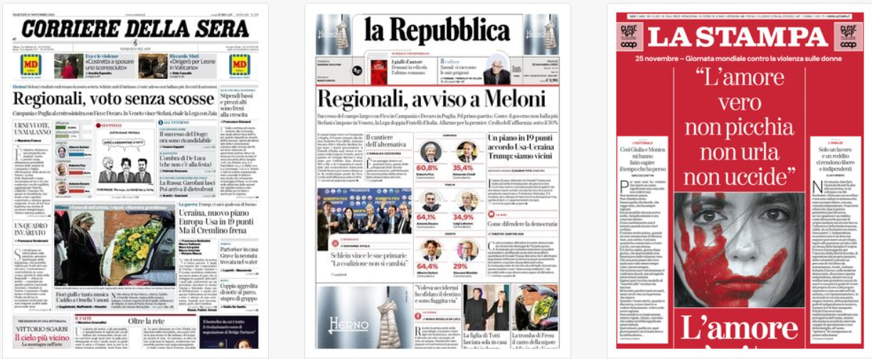 Tutti i quotidiani nazionali titolano su l'esito delle regionali. Si va da voto senza scosse a chi non salta vince le elezioni [in riferimento alla comparsata a Napoli del centro-dx], passando per la foglietta di Fico della sinistra. Fa eccezione La Stampa che invece dedica tutta la sua prima pagina alla violenza sulle donne. Anche i giornali locali delle regioni coinvolte nel voto naturalmente sui risultati del voto. Solamente Avvenire e Il Secolo XIX menzionano l'alta quota di astensionismo. Per il FT USA e Ucraina positivi sul piano di pace. Il NYTimes invece si chiede se Putin accetterà le modifiche ai 29 punti proposti. In Australia invece una senatrice dell'ultradestra australiana in aula con il burqa. È la seconda volta che lo fa.