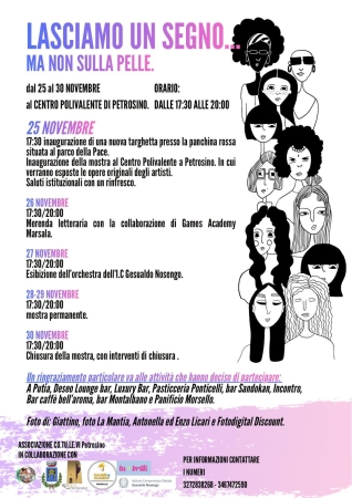 Dal 25 al 30 novembre, al Centro Polivalente di Petrosino, sarà visitabile la mostra “Lasciamo un segno… ma non sulla pelle”, che raccoglie opere di artiste e artisti del territorio e contributi provenienti da realtà locali impegnate nel sociale e nella promozione culturale. Un percorso espositivo che intende dare voce alle donne, ai volontari e alle famiglie che ogni giorno affrontano, contrastano e denunciano la violenza di genere.