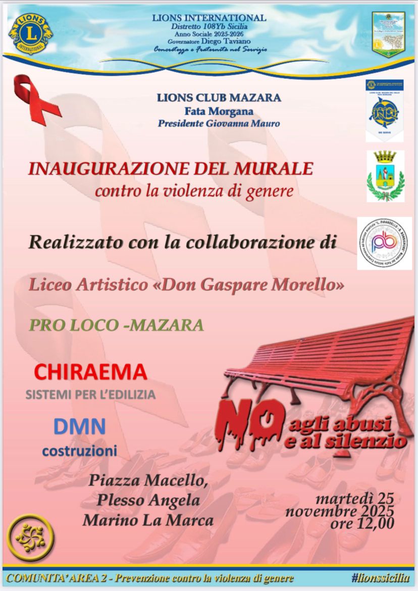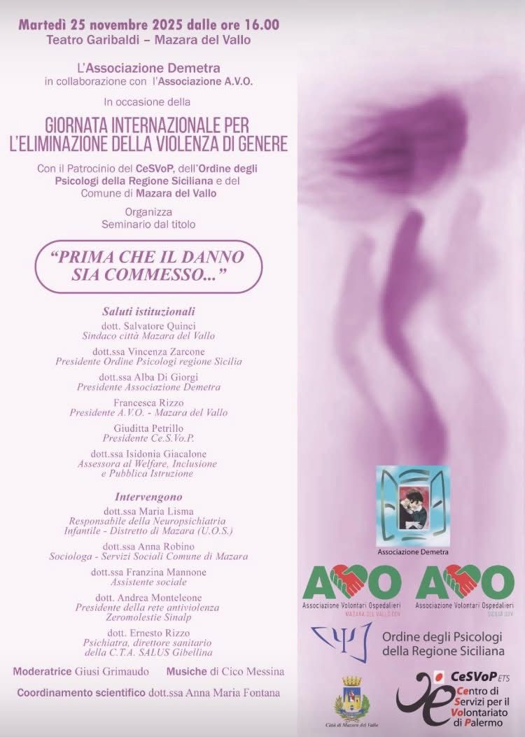 Inaugurazione del murale contro la violenza di genere il 25 novembre al Plesso La Marca Marino, su iniziativa dell’Istituto Pirandello-Bonsignore e del Lions Club, con la collaborazione del Liceo Artistico e della Pro Loco. Seminario “Prima che il danno sia commesso” al Teatro Garibaldi, con esperti del settore psicologico, sociale e sanitario, organizzato dall’associazione Demetra. Il Comune ricorda inoltre la presenza del Centro Antiviolenza attivo al Palazzo della Legalità e dei numeri utili 800495999 e 1522.