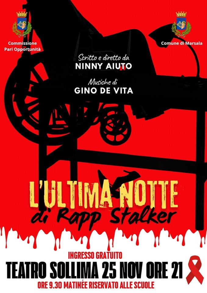 In occasione della Giornata internazionale per l’eliminazione della violenza contro le donne, la Commissione Pari Opportunità e il Comune di Marsala promuovono lo spettacolo “L’Ultima Notte di Rapp Stalker”, scritto e diretto da Ninny Aiuto, con musiche originali composte da Gino De Vita.
