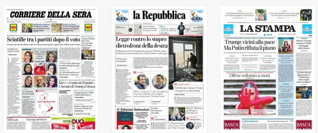 Titoli Corriere della Sera: Scintille tra i partiti dopo il voto la Repubblica: Legge contro lo stupro / dietrofront della destra La Stampa: Trump: vicini alla pace / Ma Putin rifiuta il piano Il Sole 24 Ore: Fisco, arriva la super banca dati / per dare risposte a cittadini e imprese Avvenire: L’amore che vale Il Messaggero: Conti, la Ue promuove l’Italia Il Giornale: Ucraina, primo sì alla pace Leggo: Una donna uccisa ogni tre giorni Qn: Ucraina, accordo più vicino / Kiev pronta ma Putin frena Il Fatto: Kiev si arrende a Trump / (ma non sulle cose serie) Libero: L’Europa ci impone / i matrimoni tra gay La Verità: Il nuovo astro della sinistra / insegna sesso alla materna Il Mattino: Campania, il risiko della giunta il Quotidiano del Sud: Proporzionale con premio / Centrodestra verso l’intesa il manifesto: All’ultimo / piano Domani: Trump: "Ucraina, accordo vicino" / Mosca pronta a bocciare il piano