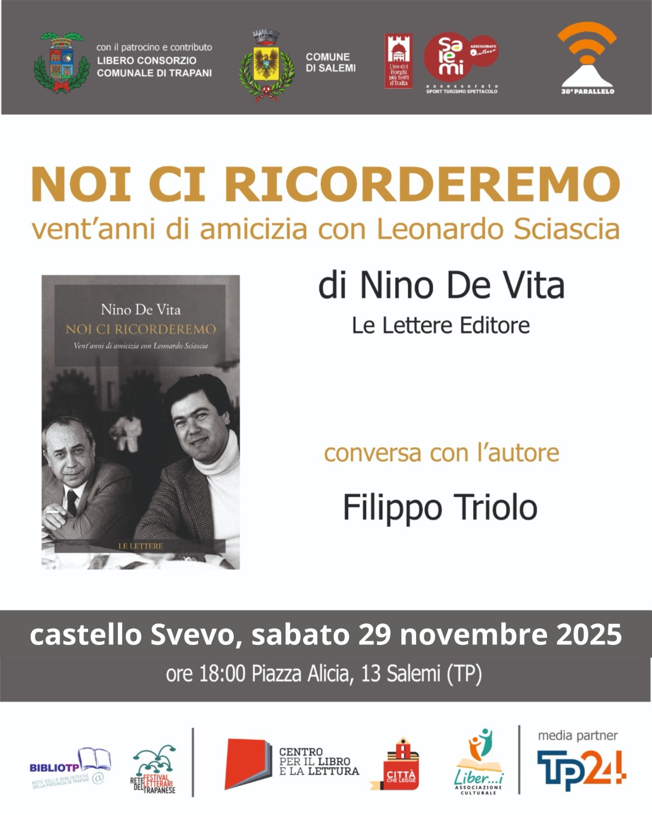 SALEMI - Sabato 29 novembre, alle 18:00, al Castello Svevo Nino De Vita presenta Noi ci ricorderemo" (Le Lettere), il libro in cui racconta la sua amicizia con Leonardo Sciascia attraverso episodi, silenzi e confidenze lunghi vent’anni. Conversa con l'autore Filippo Triolo, ingresso libero. Prossimo incontro: mercoledì 3 dicembre al Museo Regionale Agostino Pepoli di Trapani (ore 17:00), in dialogo con Giacomo Di Girolamo.