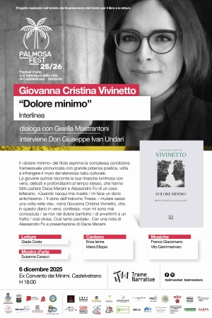 All’ex convento dei minimi, a partire dalle 18, la poetessa Giovanna Cristina Vivinetto presenterà «Dolore minimo», edito da Interlinea.