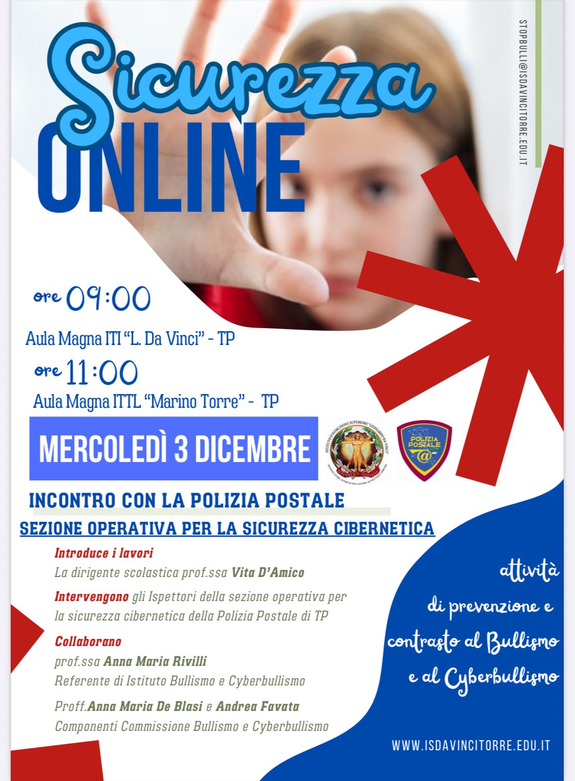 Proseguono all’Istituto “Da Vinci–Torre” le attività dedicate alla prevenzione del bullismo e del cyberbullismo. Mercoledì 3 dicembre 2025 si terranno due incontri formativi rivolti alle classi quarte dell’ITI e alle classi terze e quarte dell’ITTL, con la partecipazione del personale della Sezione Operativa per la Sicurezza Cibernetica della Polizia Postale e delle Comunicazioni di Trapani.