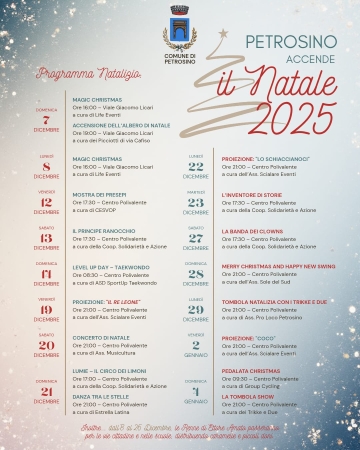 A Petrosino si accende l’atmosfera natalizia. L’amministrazione comunale, guidata dal sindaco Giacomo Anastasi, ha presentato il Calendario Natale 2025, un programma ricco di appuntamenti che animerà il mese di dicembre e i primi giorni del nuovo anno, con eventi pensati per tutte le fasce d’età.