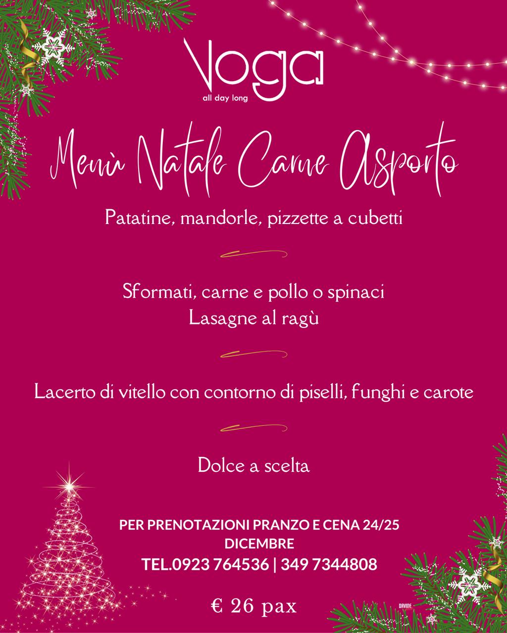 Il Natale si avvicina e con lui la consueta domanda: cucinare o farsi aiutare? Voga, caffetteria e pasticceria di piazza Piemonte e Lombardo a Marsala, ha preparato quattro menù che coprono le principali date del calendario festivo, dall'Immacolata a Capodanno. La novità di quest'anno è la possibilità di prenotare il pranzo di Natale direttamente presso i loro locali, oltre ai tradizionali menù da asporto che hanno caratterizzato le precedenti edizioni.
