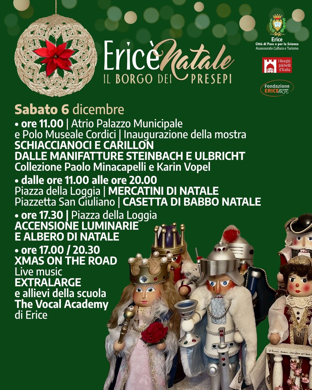 ERICE - Dal 6 dicembre 2025 al 6 gennaio 2026 Erice ospita EricèNatale, un mese di eventi tra mercatini, presepi, arte e spettacoli che trasformano il borgo medievale in un vero villaggio natalizio. In piazza Umberto I si snoda il Mercatino di Natale con artigianato, prodotti locali e dolci tipici, mentre il Borgo dei Presepi propone oltre trenta natività diffuse, incluso il presepe meccanico di Palazzo Sales. Il Palazzo Comunale accoglie una mostra di oltre cento schiaccianoci e carillon, un unicum in Sicilia. In programma spettacoli, concerti, laboratori per bambini, la Casa di Babbo Natale ed eventi di Capodanno in piazza della Loggia. Le iniziative coinvolgono anche le frazioni, rendendo EricèNatale una destinazione ideale per vivere le festività nel borgo.