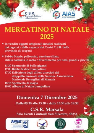 Oggi, domenica 7 dicembre, torna a Marsala il tradizionale Mercatino di Natale organizzato dal Consorzio Siciliano di Riabilitazione (CSR) e dall’AIAS Marsala ETS. L’evento, aperto a tutta la cittadinanza e ad ingresso gratuito, si svolgerà nella sede del CSR-AIAS in Contrada San Silvestro 452/A, dalle 9.30 alle 13.30 e dalle 15.30 alle 19.30.