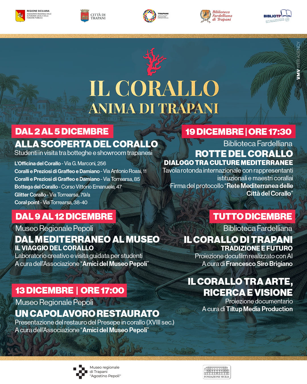 Il programma prevede una serie di attività che celebrano la tradizione corallara della città, tra cui la visita alle botteghe e showroom trapanesi, che hanno aperto le porte agli studenti per far loro scoprire il mondo della lavorazione del corallo, e il ciclo di eventi che culminerà il 19 dicembre con la tavola rotonda internazionale "Rotte del Corallo - Dialogo tra culture mediterranee". Questo incontro segnerà la firma del protocollo per la Rete Mediterranea delle Città del Corallo, un’alleanza strategica che coinvolgerà Trapani, Sciacca, Torre del Greco, Alghero, Tunisia e Andalusia, con l’obiettivo di promuovere e valorizzare questa antica tradizione artigianale. La mostra e gli eventi sono parte di un percorso che mette in luce il ruolo del corallo nella cultura trapanese, combinando tradizione, innovazione e tecnologia. Durante tutto il mese di dicembre, la Biblioteca Fardelliana ospiterà anche un percorso audiovisivo dedicato al corallo, con proiezioni di docufilm e documentari sul tema.