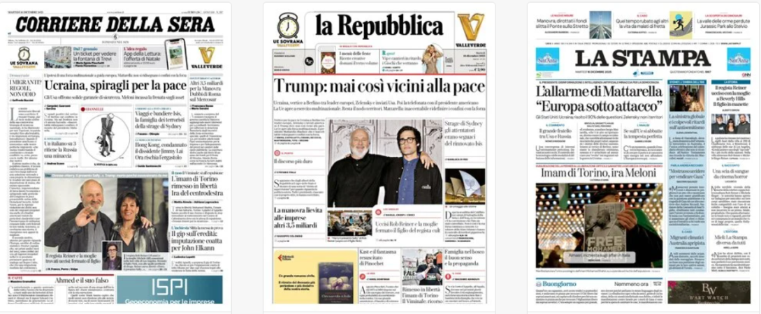 Titoli Corriere della Sera: Ucraina, spiragli per la pace la Repubblica: Trump: mai così vicini alla pace La Stampa: L’allarme di Mattarella / «Europa sotto attacco» Il Sole 24 Ore: Per le imprese 3,5 miliardi nel 2026: / fondi per Zes, Transizione 5.0 ed edilizia Il Messaggero: Ucraina, la pace più vicina Il Giornale: Svolta Ucraina / «Intesa al 90%» Qn: Ucraina, tregua possibile / Forza multinazionale per Kiev Avvenire: Luce per l’Ucraina Il Fatto: «Accordo sul 90 %» / Ma non sui territori Leggo: Ucraina, spiragli di pace Libero: Il governo arresta, il giudice libera La Verità: I giudici liberano l’imam che tifa stragi Il Mattino: Manovra, Zes e investimenti / 3,5 miliardi per le imprese il manifesto: Il tetto che scotta il Quotidiano del Sud: Ucraina, spiragli di pace Domani: Kiev, meno territori e più garanzie / Gli Usa: «Mosca accetterà l’intesa»