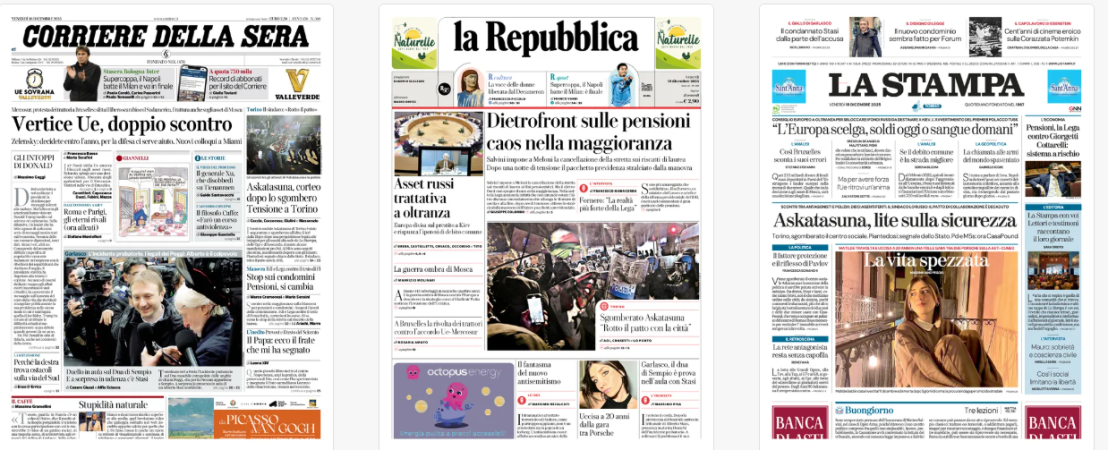 Titoli Corriere della Sera: Vertice Ue, doppio scontro la Repubblica: Dietrofront sulle pensioni, / caos nella maggioranza La Stampa: Askatasuna, lite sulla sicurezza Il Sole 24 Ore: Pensioni, è scontro tfra governo e Lega / Rischio retrocessione per incentivi 5.0 Avvenire: Non c’è pace col riarmo Il Messaggero: Ue, si tratta sugli asset russi Il Giornale: I disoccupati di Askatasuna Leggo: Siamo di meno e più vecchi Qn: Manovra, norma pro armi / Dietrofront sulle pensioni Il Fatto: La Manovra fra le risse / e il concerto di Baglioni Libero: Stato di pulizia La Verità: Vogliono tapparci la bocca Il Mattino: Ue, trattativa sugli asset russi il Quotidiano del Sud: Beni russi, lo scatto di Merz il manifesto: Le mani / sulla città Domani: Asset russi, Zelensky pressa l’Ue / Tusk: «Soldi oggi o sangue domani»