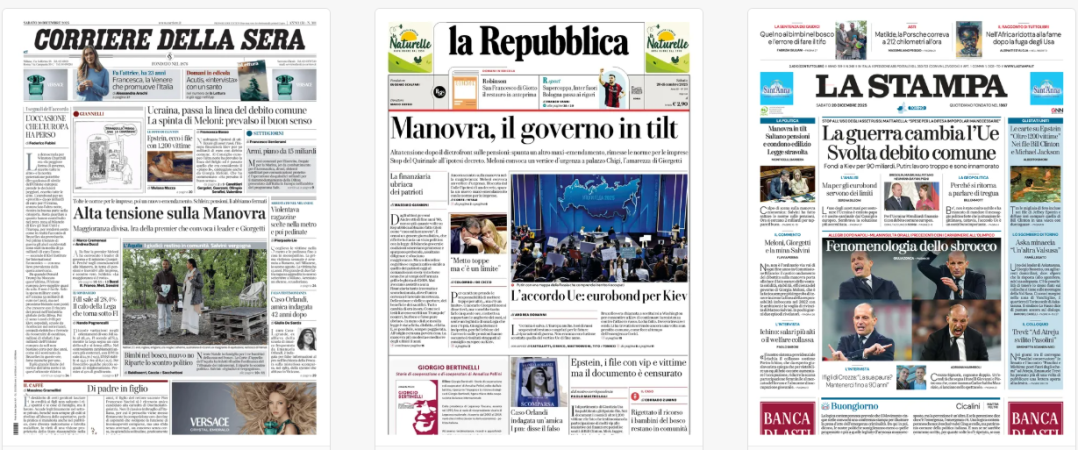 Titoli Corriere della Sera: Alta tensione sulla Manovra la Repubblica: Manovra, governo in tilt La Stampa: La guerra cambia l’Ue / Svolta debito comune Il Sole 24 Ore: Caos manovra: nuovo emendamento / per ripescare Tfr, edilizia, imprese e Zes Avvenire: Molto più paritarie Il Messaggero: Europa, maxi prestito a Kiev Il Giornale: Devastazioni e agenti feriti / Tassa Askatasuna da 7 milioni Qn: Manovre ad alta tensione / Imprese, blitz di Meloni Il Fatto: Manicomio / armato Libero: «Avanti tutta con gli sgomberi» La Verità: Rivolta contro i giudici / che ci tappano la bocca Il Mattino: Ucraina, 90 miliardi dall’Europa il Quotidiano del Sud: Kiev, il compromesso di Meloni il manifesto: I nolenterosi Domani: L’Ue finanzia Kiev, ma senza asset / Merz è sconfitto, Meloni festeggia