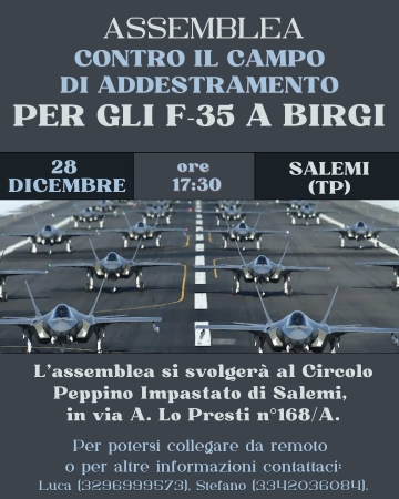Un’assemblea pubblica per discutere del progetto di realizzazione del più grande campo di addestramento per caccia F-35 d’Europa previsto all’aeroporto militare di Birgi, tra Marsala e Trapani. L’incontro si terrà sabato 28 dicembre alle ore 17.30 a Salemi, al Circolo Peppino Impastato, ed è promosso da realtà e cittadini che chiedono maggiore informazione e confronto su una proposta destinata ad avere un forte impatto sul territorio.
