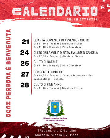 Il giorno di Natale, mercoledì 25 dicembre, il culto di Natale si terrà alle ore 11.00 a Marsala, nel tempio valdese di vicolo Evangelico della Pace.