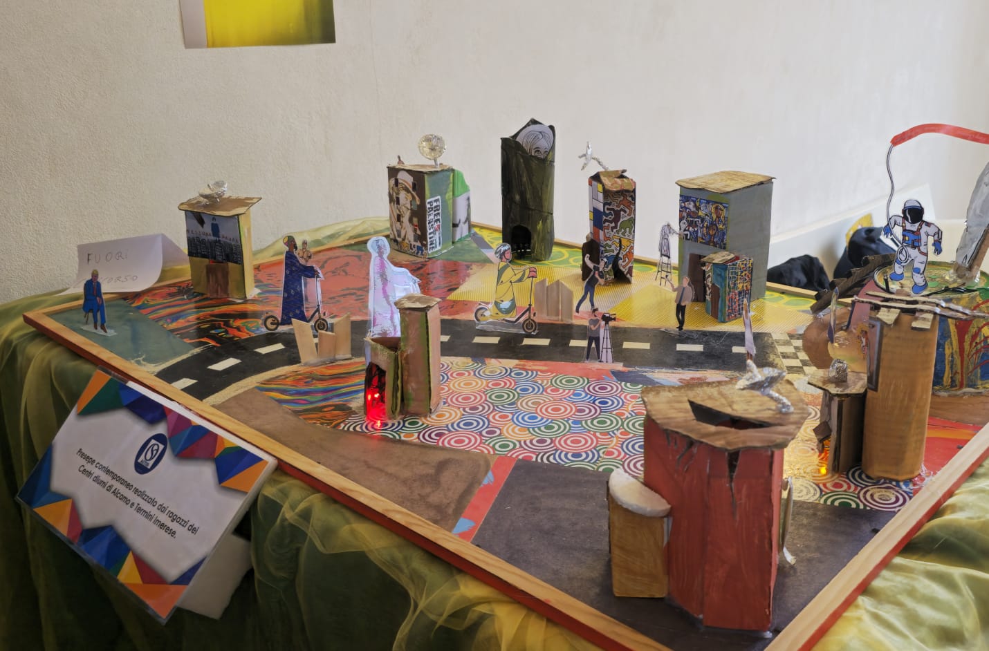 Alla realizzazione dell’opera hanno contribuito anche i ragazzi del Centro Diurno per l’Autismo di Termini Imerese. Nel presepe compaiono personaggi della politica, dello spettacolo e della tradizione cristiana, inseriti in un’ambientazione che mescola una città devastata dalla guerra – impegnata a risollevarsi attraverso la riqualificazione urbana – con lo scenario classico della Natività.