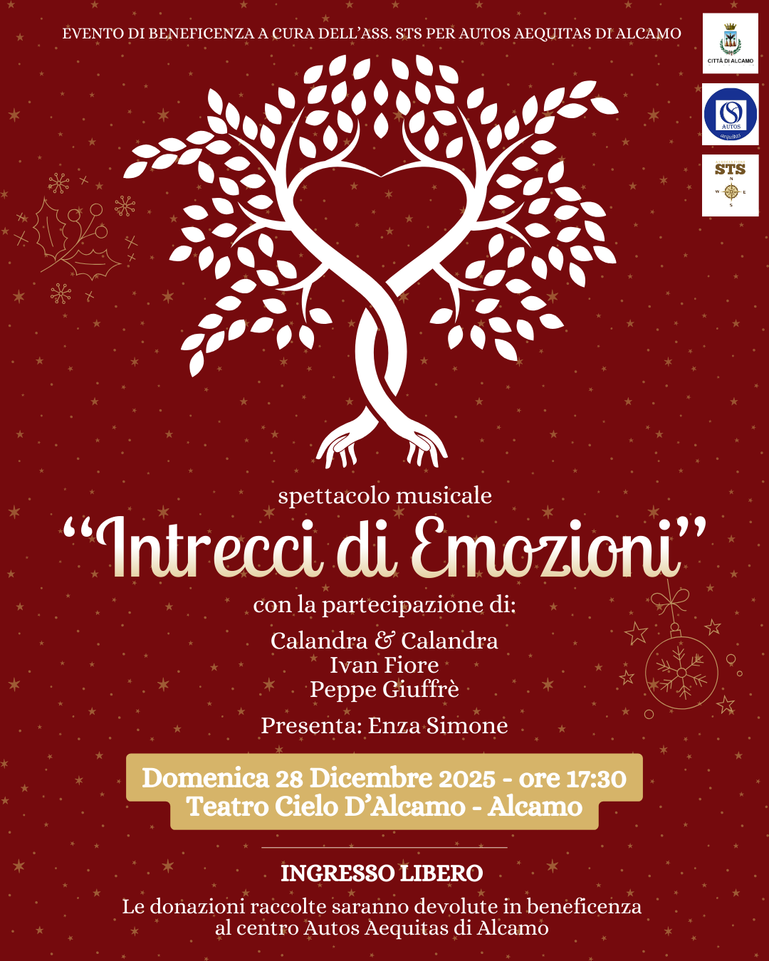 Infine, nell’ambito del palinsesto natalizio, si ricorda che domenica 28 dicembre, alle 17.30, al teatro Cielo d’Alcamo andrà in scena lo spettacolo musicale “Intrecci di Emozioni”. L’ingresso sarà libero e sarà possibile, per chi lo desidera, effettuare una donazione in beneficenza a sostegno del Centro AUTOS.