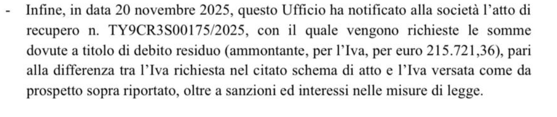 – viene notificato uno schema di atto di recupero per IVA indebitamente compensata, pari a 539.297,88 euro, oltre sanzioni e interessi;