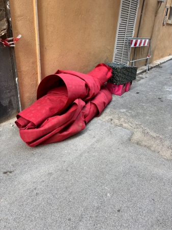 Vi scrivo per l’ennesimo episodio discutibile da parte del nostro Comune. Questa mattina gli addetti allo smontaggio delle casette di Via Roma hanno regolarmente smontato e caricato sul camion le strutture ma… il tappeto rosso è stato arrotolato e abbandonato in Via Titone (foto).