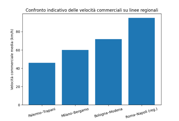 Nel confronto con altre direttrici regionali italiane, la Palermo–Trapani mostra una velocità commerciale nettamente inferiore. Per percorrere circa 140 chilometri sono necessarie oltre tre ore, con una media intorno ai 45 km/h, uno dei valori peggiori segnalati dal rapporto Pendolaria di Legambiente.