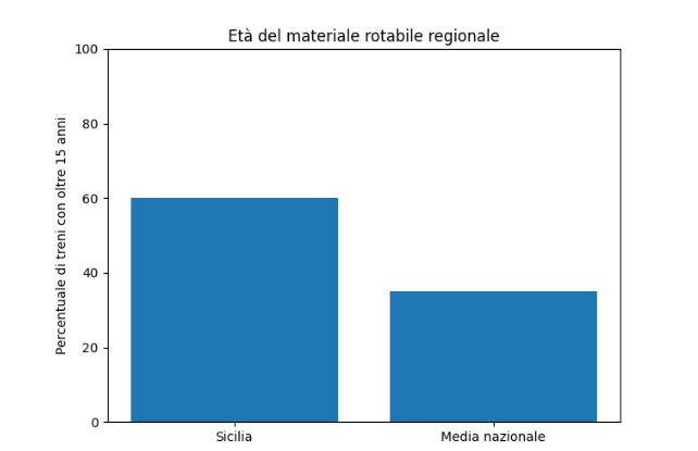 In Sicilia il 60% dei treni regionali ha più di quindici anni, una percentuale nettamente superiore alla media nazionale. L’età avanzata del materiale rotabile incide negativamente su affidabilità, comfort e regolarità del servizio, come evidenziato dal rapporto Pendolaria di Legambiente.