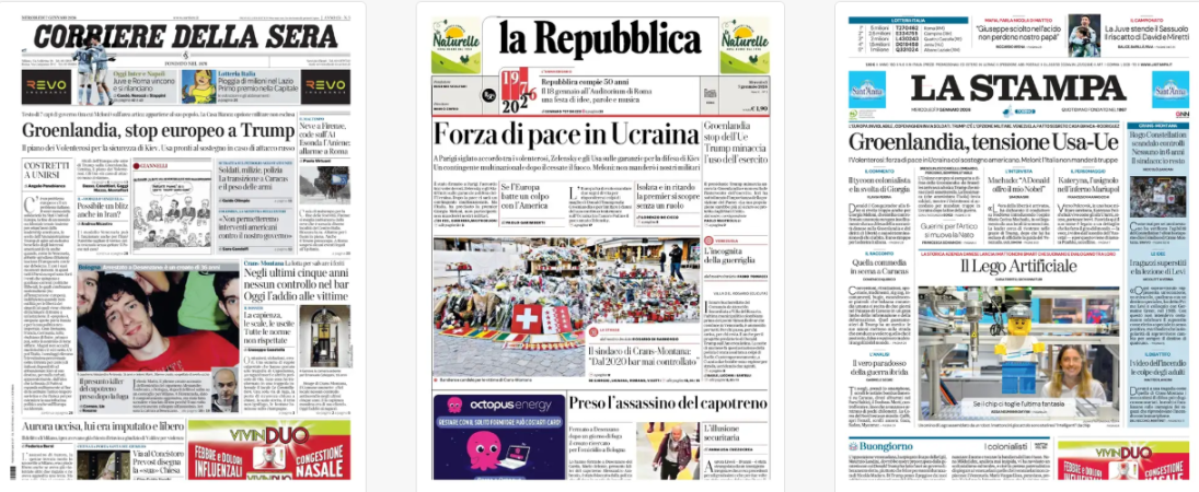 Titoli Corriere della Sera: Groenlandia, stop europeo a Trump la Repubblica: Forza di pace in Ucraina La Stampa: Groenlandia, tensione Usa-Ue Il Sole 24 Ore: La Ue anticipa i fondi per l’agricoltura / Strada aperta per il sì al Mercosur Avvenire: Trentini e altri 27 Il Messaggero: Il bar della strage senza controlli Il Giornale: Il dossier di Mr Report: / dieci milioni di file sui vip Qn: Altolà dell’Europa a Trump / “La Groenlandia non si tocca” Il Fatto: Cortina è medaglia / d’oro dello scempio Libero: La prova che inchioda gli svizzeri La Verità: Gli immigrati che accoltellano: / Capotreno ucciso, agente ferito Il Mattino: Kiev, sì alla forza multinazionale il Quotidiano del Sud: Groenlandia e Kiev, l’Ue reagisce il manifesto: C’è del marcio Domani: Groenlandia, l’alt dei Volenterosi / “Ecco il piano per le truppe a Kiev”