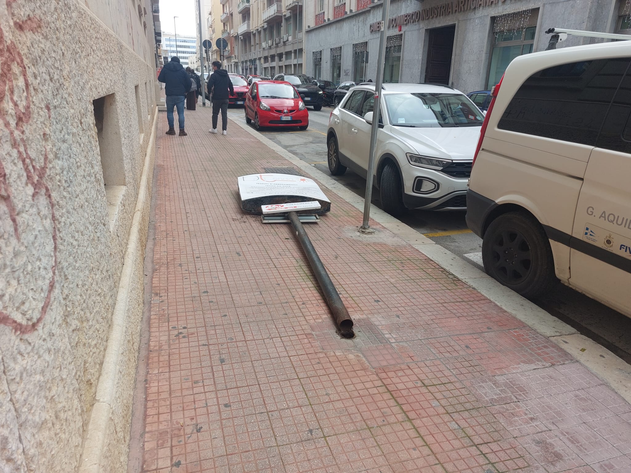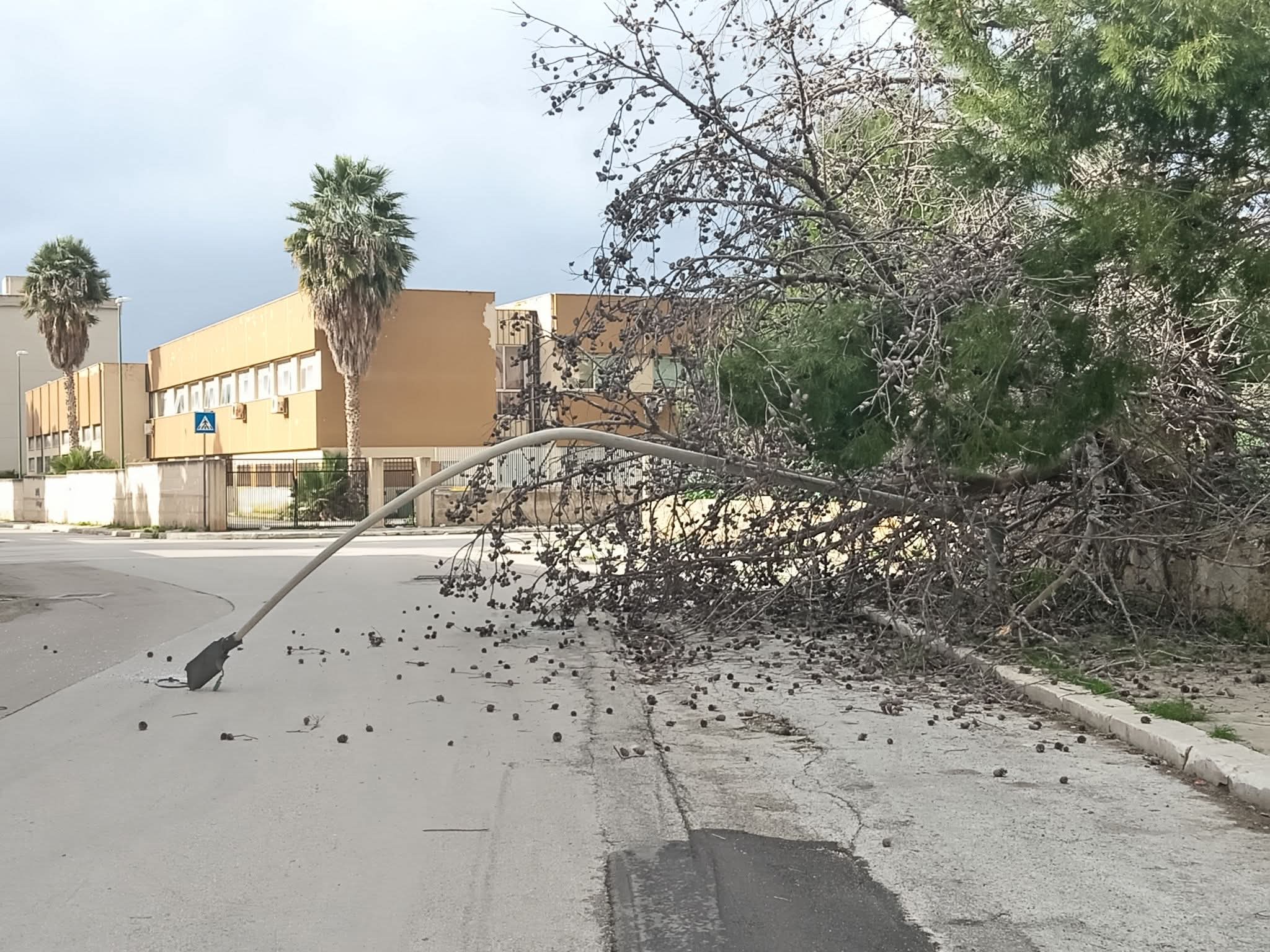 A Trapani il bilancio raccontato dalle segnalazioni dei cittadini è pesante. In corso Italia, in una zona trafficata, un palo è finito a terra sul marciapiede, a pochi passi dalla succursale dell’Istituto di Istruzione Superiore “Rosina Salvo”, che ospita il Liceo delle Scienze Umane (opzione Economico-Sociale) e altre sezioni.