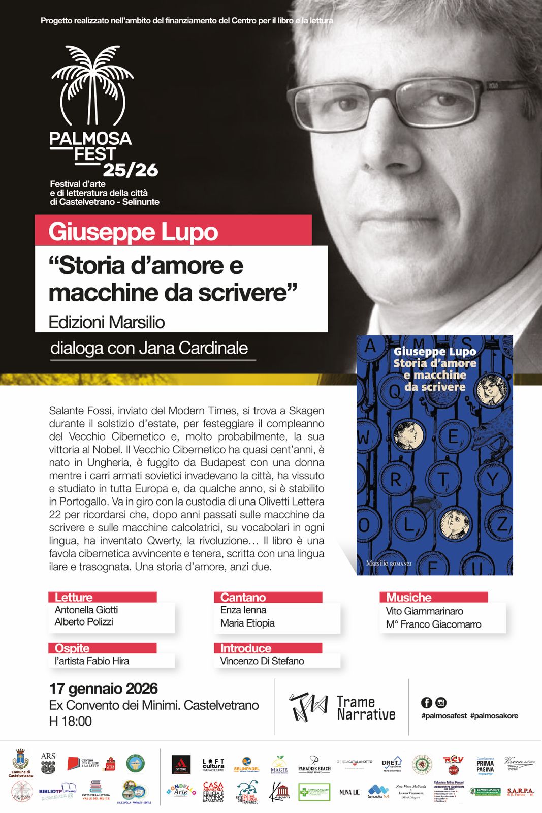 Terzo appuntamento, sabato 17 gennaio, con il PalmosaFest, il festival d’arte e di letteratura della città di Castelvetrano giunto alla sua quarta edizione. Alle 18, negli spazi dell’ex convento dei Minimi, protagonista sarà lo scrittore Giuseppe Lupo, che presenterà il romanzo “Storia d’amore e macchine da scrivere”, edito da Marsilio.