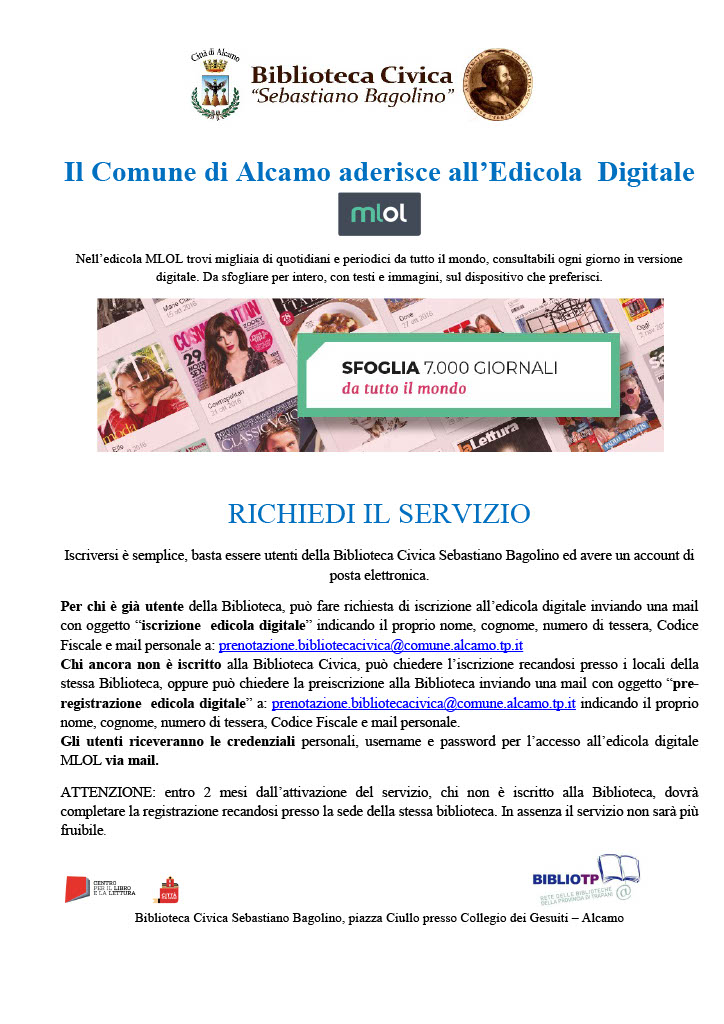 Resta attivo anche il servizio di consultazione online del catalogo attraverso il portale biblioTP, con la possibilità di prenotare i testi via email all’indirizzo: prenotazione.bibliotecacivica@comune.alcamo.tp.it.