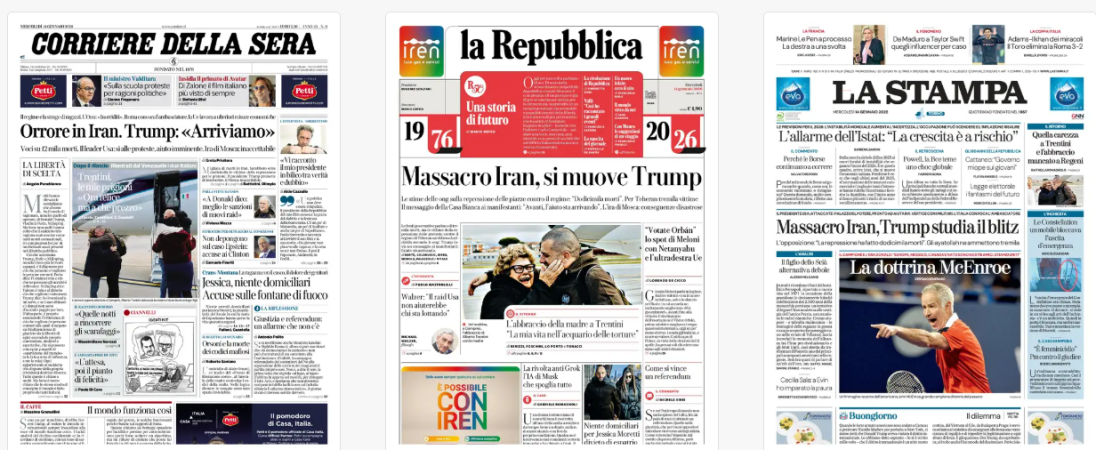 Titoli Corriere della Sera: Orrore in Iran. Trump: «Arriviamo» la Repubblica: Massacro Iran, si muove Trump La Stampa: Massacro Iran, Trump studia il blitz Il Sole 24 Ore: Powell, la difesa dei banchieri centrali / Trump: è un incompetente, tagli i tassi Avvenire: Regime di morte Il Messaggero: Trump agli iraniani: arriviamo Il Giornale: Arrivano i nostri Leggo: Trump agli iraniani: «Arriviamo» Qn: Migliaia di morti in Iran / Trump: l’aiuto è in arrivo Il Fatto: Trump promette "aiuti" / all’Iran: si salvi chi può Libero: Non è giustizia: 5 anni / a chi stupra bambine La Verità: 240mila euro per il carabiniere Il Mattino: Iran, Trump incita la piazza il Quotidiano del Sud: Teheran, l’orrore e la speranza il manifesto: La via di Teheran Domani: Iran, il massacro dei ragazzi / Trump: «Stiamo arrivando»
