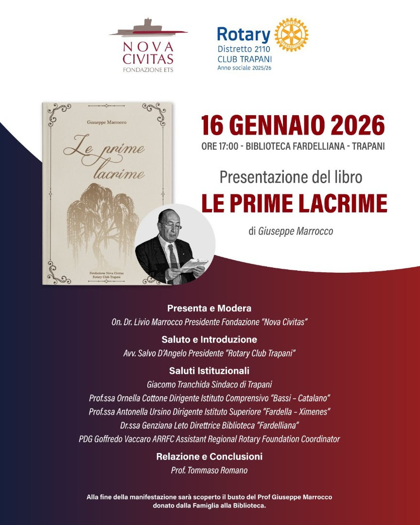Venerdì 16 gennaio 2026, alle ore 17, la Biblioteca Fardelliana di Trapani ospiterà la presentazione del volume “Le prime lacrime” di Giuseppe Marrocco, iniziativa promossa dalla Fondazione Nova Civitas ETS in collaborazione con il Rotary Club Trapani.