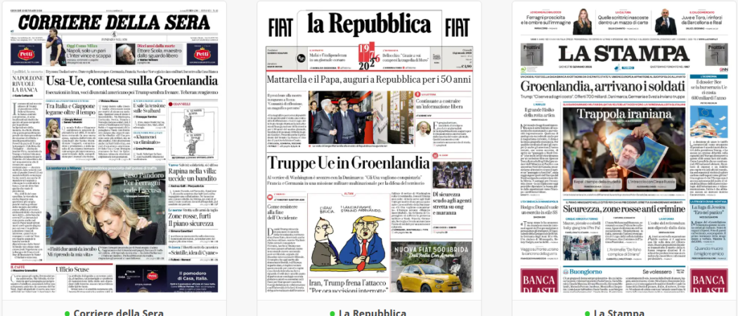 Titoli Corriere della Sera: Usa-Ue, contesa sulla Groenlandia la Repubblica: Truppe Ue in Groenlandia La Stampa: Groenlandia, arrivano i soldati Il Sole 24 Ore: Cina, surplus record a 1.200 miliardi Il Messaggero: Iran, paura per 600 italiani Il Giornale: L’Antimafia inchioda De Raho / «Sapeva tutto dei dossier» Avvenire: L’Iran nel mirino Qn: Iran, pronto il blitz di Trump / Teheran minaccia le basi Usa Il Fatto: «Se vince il Sì abolisco / il trojan sulle tangenti» Leggo: Groenlandia, sale la tensione Libero: Città più sicure: ecco la legge La Verità: Arriva la legge salva agenti Il Mattino: Azzurro pallido il manifesto: Impresa di polizia il Quotidiano del Sud: Iran, Trump verso l’attacco Domani: Iran tra rastrellamenti e omicidi / Trump pronto al raid su Teheran