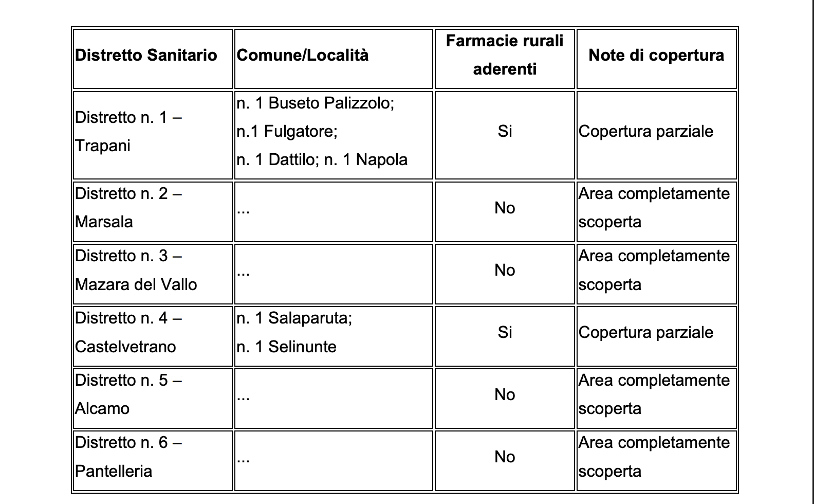 Per colmare queste criticità, l’ASP ha pubblicato un nuovo avviso rivolto alle farmacie urbane, con l’obiettivo di garantire la piena copertura del territorio. La manifestazione di interesse è rivolta a tutte le farmacie territoriali urbane della provincia di Trapani convenzionate con il Servizio sanitario nazionale (SSN).