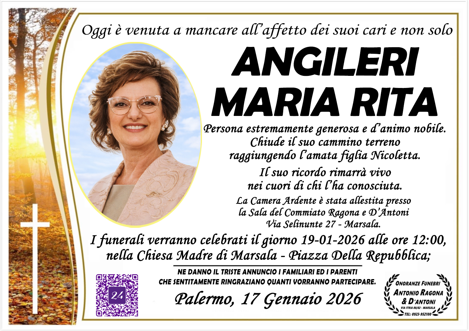 I funerali si terranno lunedì 19 gennaio alle ore 12:00 nella Chiesa Madre di Marsala.