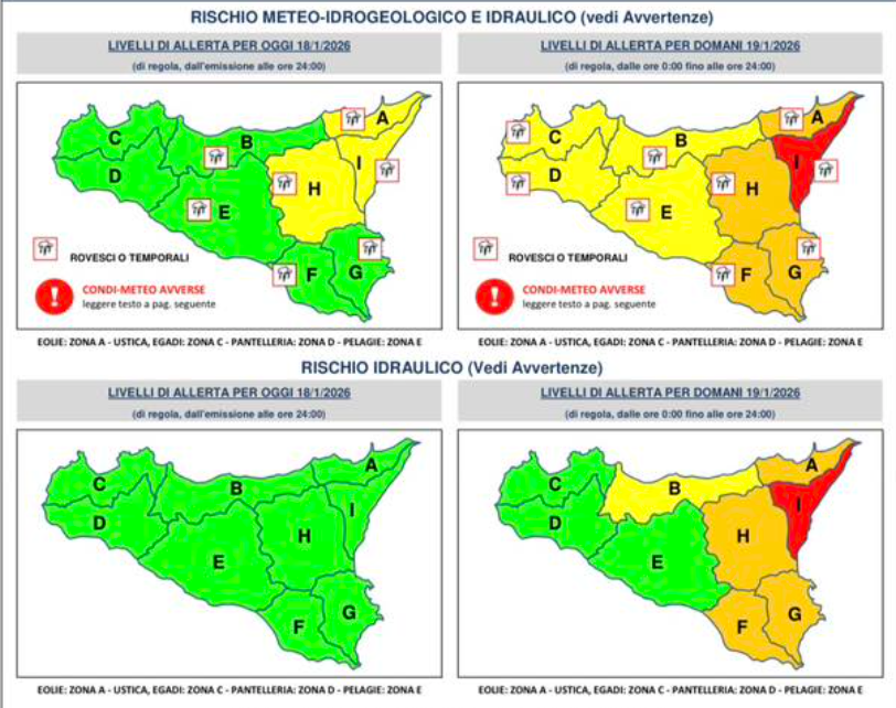 La situazione si aggraverà domani, lunedì 19 gennaio, dalle ore 00 alle 24: Allerta gialla nelle zone B, C, D ed E; Allerta arancione nelle zone A, F, G e H; Allerta rossa nella zona I, dove è atteso il massimo livello di criticità.