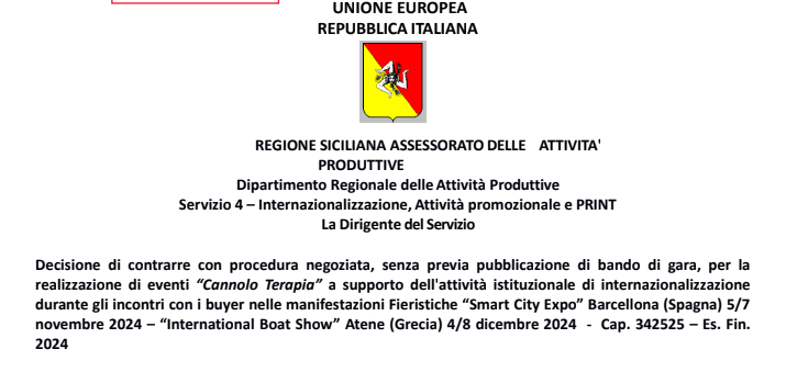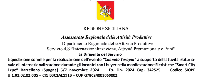 Il 9 ottobre 2024 il Dipartimento dell’assessorato regionale alle Attività produttive decide di procedere con affidamento diretto, senza bando, per la realizzazione di eventi denominati “Cannolo Terapia”, a supporto dell’attività di “internazionalizzazione” durante due fiere:
