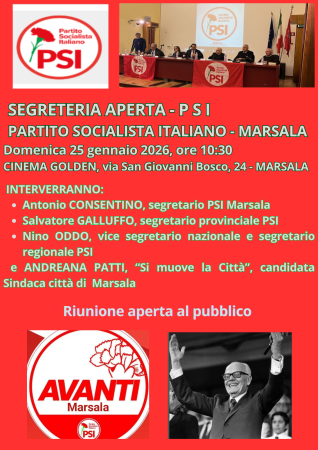 Il Partito Socialista Italiano di Marsala annuncia una segreteria aperta a militanti, simpatizzanti e cittadini per domenica 25 gennaio 2026, alle ore 10:30, presso il Cinema Golden. L’iniziativa rappresenta un momento strategico per il rilancio del Partito in città, in vista delle elezioni amministrative della prossima primavera.