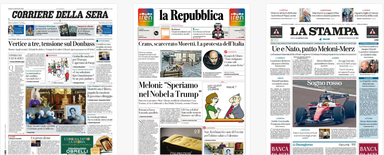 Titoli Corriere della Sera: Vertice a tre, tensione sul Donbass la Repubblica: Meloni: «Speriamo / nel Nobel a Trump» La Stampa: Ue e Nato, patto Meloni-Merz Il Sole 24 Ore: Mercosur, pressing per lo sblocco Avvenire: Investimenti pericolosi Il Messaggero: Meloni-Mertz, il patto di Roma Il Giornale: Vergogna svizzera / Moretti torna libero Meloni: «Oltraggio» Qn: Difesa, Roma Berlino unite / «L’Ue abbia più coraggio» Il Fatto: Milano-Cortina: l’Ice / scorterà gli atleti Usa Libero: Svizzera, giustizia da cioccolatai La Verità: In carcere comandano 36 imam Il Mattino: Europa, svolta Meloni-Merz il Quotidiano del Sud: Meloni-Merz, patto al centro il manifesto: Affinità / elettiva Domani: Kiev-Gaza, Meloni coccola Trump «Nobel se c’è pace, aperti al board»