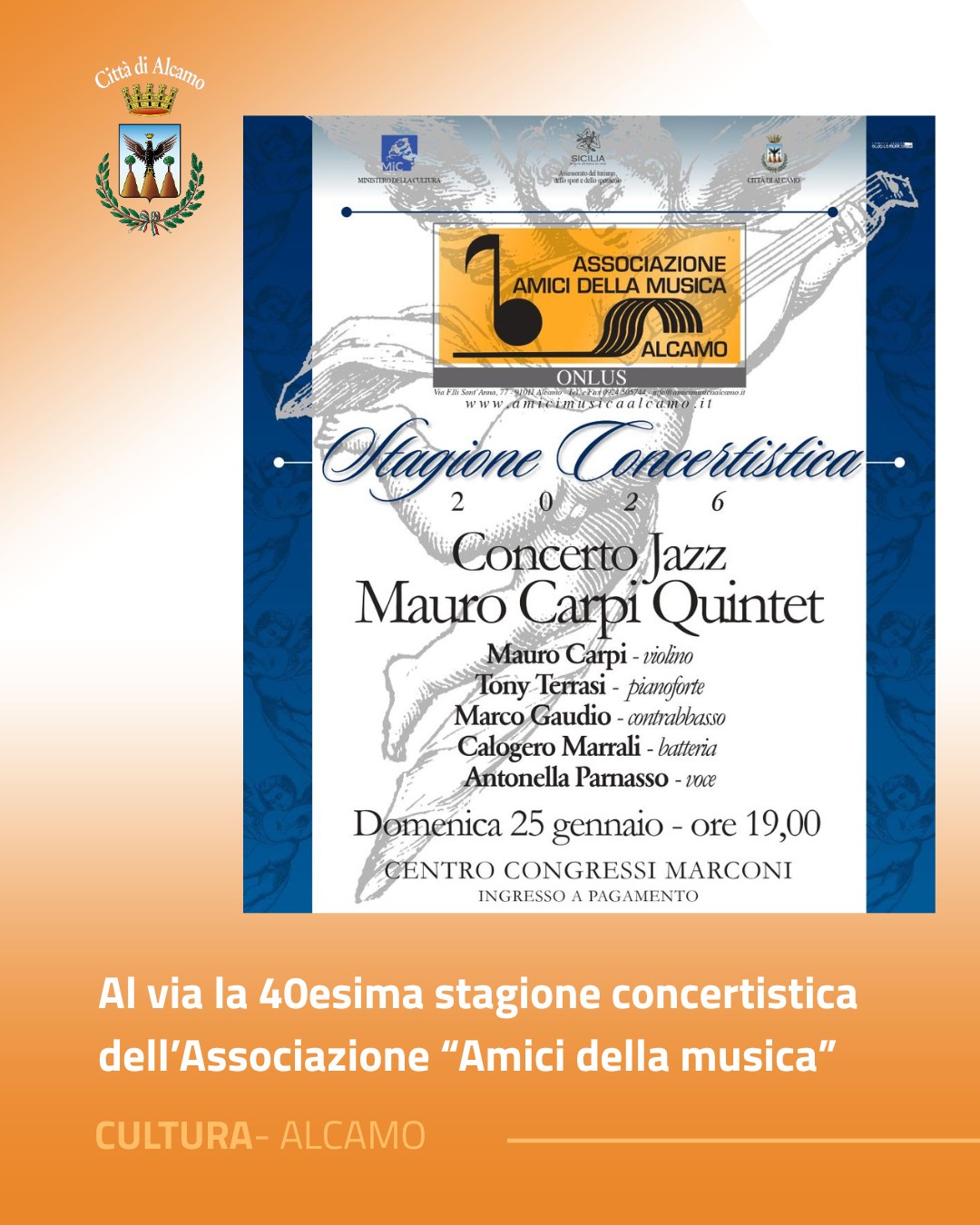 Domenica 25 gennaio, alle 19, all’Auditorium del Centro Congressi Marconi si apre la 40ª Stagione Concertistica degli Amici della Musica. In programma il concerto del Mauro Carpi Quintet, con brani di Gershwin, Porter, Venuti e Grappelli. È il primo di 17 concerti distribuiti nel 2026.
